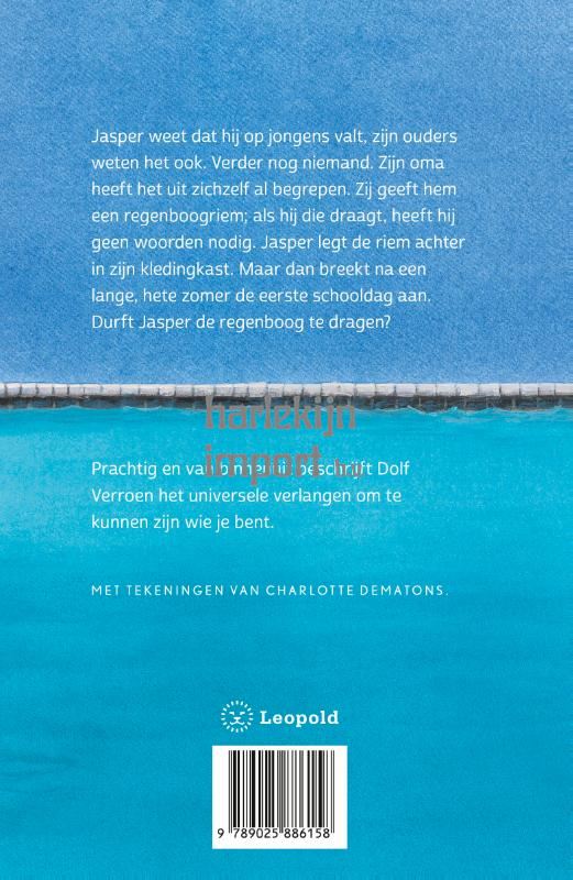 Jasper weet dat hij op jongens valt, zijn ouders weten het ook. Verder nog niemand. Zijn oma heeft het uit zichzelf al begrepen. Zij geeft hem een regenboogriem; als hij die draagt, heeft hij geen woorden nodig. Jasper legt de riem achter in zijn kledingkast. Maar dan breekt na een lange, hete zomer de eerste schooldag aan. Durft Jasper de regenboog te dragen? Prachtig en van binnenuit beschrijft Dolf Verroen het universele verlangen om te kunnen zijn wie je bent.