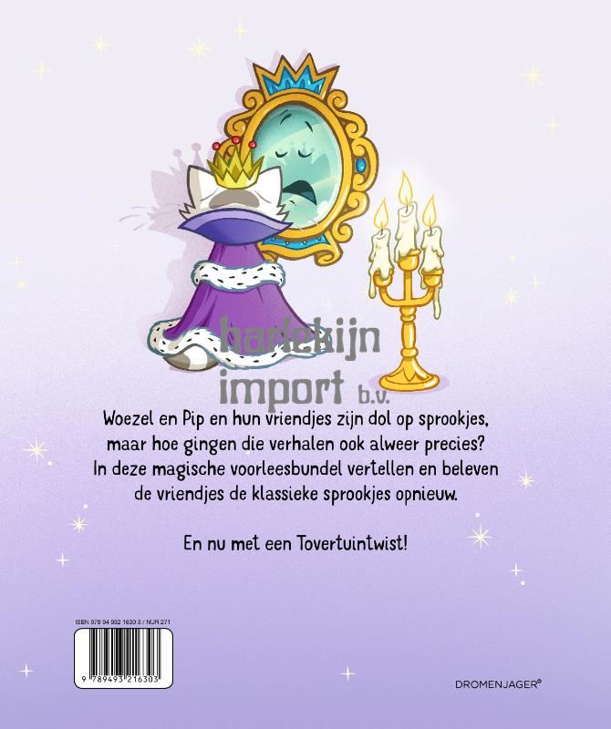 Sprookjes uit de Tovertuin is de nieuwste magische aanwinst in de Woezel & Pip voorleesbundelreeks! Woezel en Pip en hun vriendjes zijn dol op sprookjes, maar hoe gingen die verhaaltjes ook alweer precies? De kikkerprins wil altijd kikker blijven, Roodkapje wordt vriendjes met de wolf, Hans en Grietje ontmoeten de tandenfee, de prins van Assepoester speelt het liefst in de zandbak en de stiefmoeder van Sneeuwwitje stuurt Sneeuwwitje op vakantie naar het land van de zeven dwergen omdat zij de liefste wil zijn. In deze magische voorleesbundel vertellen en beleven de vriendjes de klassieke sprookjes opnieuw met elkaar. Maar nu met Tovertuintwist! Sprookjes uit de Tovertuin zorgt voor een voorleesmoment vol fantasie en plezier!