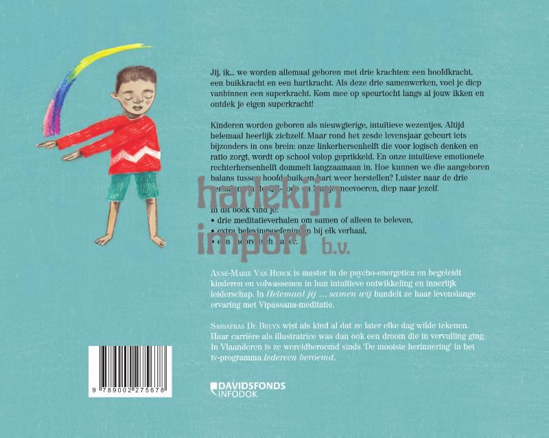 Jij, ik... we worden allemaal geboren met drie krachten: een hoofdkracht, een buikkracht en een hartkracht. Als deze drie samenwerken, voel je diep vanbinnen een superkracht . Kom mee op speurtocht langs al jouw ikken en ontdek je eigen superkracht! Kinderen worden geboren als nieuwgierige, intuïtieve wezentjes. Altijd helemaal heerlijk zichzelf . Maar rond het zesde levensjaar gebeurt iets bijzonders in ons brein: onze linkerhersenhelft die voor logisch denken en ratio zorgt, wordt op school volop geprikkeld. En onze intuïtieve emotionele rechterhersenhelft dommelt langzaamaan in. Hoe kunnen we die aangeboren balans tussen hoofd, buik en hart weer herstellen? Luister naar de drie verhalen via de QR-code en laat je meevoeren door de prachtige illustraties van Sassafras De Bruyn, diep naar jezelf. In dit boek vind je: • drie meditatieverhalen om samen of alleen te beleven, • extra belevingsoefeningen bij elk verhaal, • een theoretisch kader.