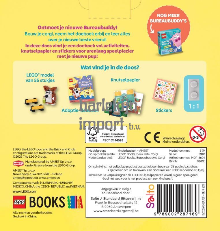 Ontmoet je nieuwe Bureaubuddy! In deze doos vind je 55 LEGO® stukjes om je eigen corgi te bouwen, een adoptieboek boordevol activiteiten, knutselpapier en leuke stickers. Maak je klaar om heel wat avonturen te beleven met je nieuwe beste vriend!