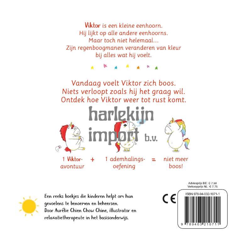 Viktor is een kleine eenhoorn. Hij lijkt op alle andere eenhoorns. Maar toch niet helemaal… Zijn regenboogmanen veranderen van kleur bij alles wat hij voelt. Vandaag voelt Viktor zich boos. Niets verloopt zoals hij het graag wil. Ontdek hoe Viktor weer tot rust komt. 1 Viktorverhaal + 1 ademhalingsoefening = niet meer boos Een reeks boekjes die kinderen helpt om hun gevoelens te benoemen en beheersen. Door Aurélie Chien Chow Chine, illustrator en relaxatietherapeute in het basisonderwijs.
