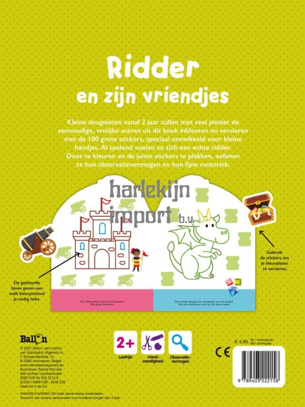 Vier leuke stickerboeken voor de allerkleinsten vanaf 2 jaar. De covers hebben een aantrekkelijke uitkap in de vorm van een fee, zeemeermin, ridder of brandweerman. Het binnenwerk bevat eenvoudige scènes die het kind kan versieren met grote stickers. Alle dieren en figuren kunnen ook ingekleurd worden. Er is duidelijk aangegeven waar de stickers moeten komen. Bovendien komt op elke bladzijde maar één soort sticker voor, wat het heel laagdrempelig maakt voor de kleinsten.