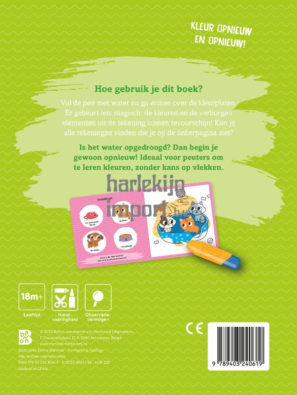 Het populaire concept 'Kleuren met water' bestaat nu ook voor de allerkleinsten rond het thema babydieren, met een aangepaste pen en in kartonboekformaat. Peuters vanaf 18 maanden kunnen zo leren kleuren zonder vlekken te maken. Door de aangepaste zoekopdrachten leren ze bovendien heel wat bij.