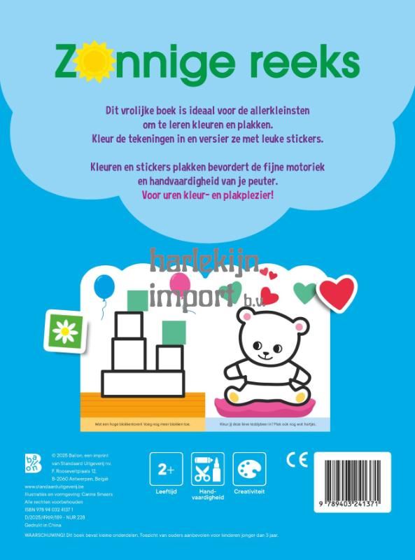 Dit vrolijke boek is ideaal voor de allerkleinsten om te leren kleuren en plakken. Kleur de tekeningen in en versier ze met leuke stickers. Kleuren en stickers plakken bevordert de fijne motoriek en handvaardigheid van je peuter. Voor uren kleur- en plakplezier!
