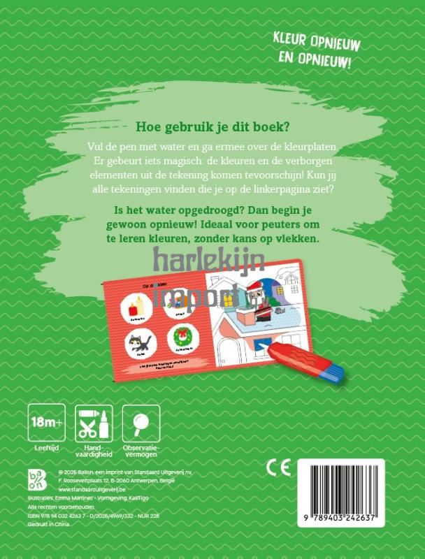 Het populaire concept 'Kleuren met water' bestaat nu ook voor de allerkleinsten rond het thema Kerstmis, met een aangepaste pen en in kartonboekformaat. Peuters vanaf 18 maanden kunnen zo leren kleuren zonder vlekken te maken. Door de aangepaste zoekopdrachten leren ze bovendien heel wat bij.