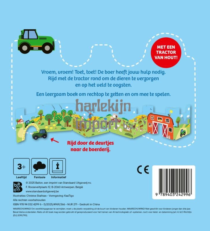 Vroem, vroem! Toet, toet! De boer heeft jouw hulp nodig. Rijd met de tractor rond om de dieren te verzorgen en op het veld te oogsten. Een leerzaam boek om rechtop te zetten en om mee te spelen.