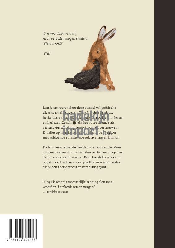 ‘Eén woord zou van mij nooit verboden mogen worden.’ ‘Welk woord?’ ‘Wij.’ Laat je ontroeren door deze bundel vol poëtische dierenverhalen, waarin Tiny Fisscher opnieuw herkenbare situaties schetst die uitnodigen tot lezen en herlezen. Ze schrijft dit keer over thema’s als verlies, vertwijfeling, hoop, troost en vertrouwen. Dit alles op haar kenmerkende lichtvoetige toon, met voldoende ruimte voor relativering en humor. De hartverwarmende beelden van Iris van der Veen vangen de sfeer van de verhalen perfect en voegen er diepte en karakter aan toe. Deze bundel is weer een oogstrelend cadeau – voor jezelf of voor ieder ander die je een beetje troost en verstilling gunt.