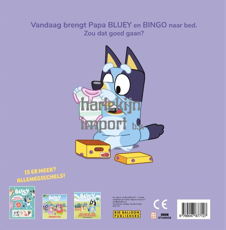 In het nieuwste Bluey-prentenboek, 'Bedtijd met Papa', gaat mama naar een babyshower, dus brengt magnifieke spelleider papa Bluey en Bingo naar bed. De vraag is natuurlijk of dat wel goed zal gaan... Bluey is een lieve en energieke puppy die samen met haar zusje Bingo en hun vader en moeder woont. Door haar eindeloze energie en fantasie beleeft ze bijzondere avonturen en wordt er veel gespeeld en gelachen met haar vrienden en familie. Bluey is een Australische animatieserie voor kleuters. De serie is een wereldwijde hit waar zowel boekuitgaven als speelgoed heel goed verkopen. Bluey wordt gezien als de tweede Peppa Pig. De serie wordt in Nederland en Belgiƫ uitgezonden op Disney Channel en Disney+.