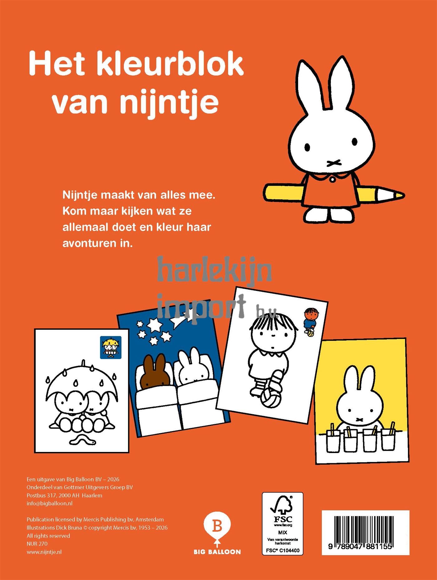 Nijntje heeft haar kleurpotloden en haar kwasten al gepakt, kleur je met haar mee in 'nijntje kleurblok'? Wat is er nou fijner dan een middagje kleuren aan de keukentafel? Met een kleurboek- of doeboek ontwikkelen kinderen niet alleen hun motoriek, maar ook hun creativiteit en fantasie. En ze maken nog iets moois ook! Het konijntje nijntje pluis is de hoofdpersoon van een serie kinderprentenboeken, geschreven en getekend door Dick Bruna. De avonturen van Nijntje zijn herkenbaar door de eenvoud en onschuldigheid, met een vleugje humor en positiviteit. Dit geeft een gevoel van warmte en veiligheid waardoor ze kinderen over de hele wereld aanspreekt. De serie is te bekijken op Netflix en YouTube. Bekijk ook de rest van onze collectie kleurboeken en kleurblokken voor kinderen, van bekende karakters als Bing of Peppa Pig. Dat betekent nog meer kleurrijke avonturen en creatief plezier voor jonge kunstenaars.