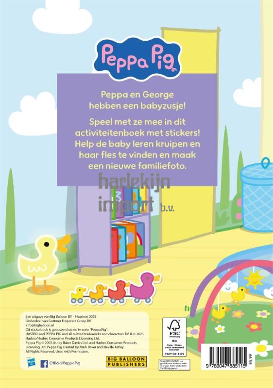 In Peppa Pig's stickerboek 'Een zusje voor Peppa', krijgen Peppa en George een babyzusje! Speel met ze mee in dit activiteitenboek met stickers. Help de baby leren kruipen, vind haar fles en maak een nieuwe familiefoto. Peppa Pig is het schattige en ondeugende biggetje uit de gelijknamige wereldberoemde en razend populaire animatieserie. Ze woont samen met haar kleine broertje George, Mama Big en Papa Big en houdt van spelletjes spelen, verkleden, dagjes uit en in modderpoelen springen! Peppa's avonturen eindigen altijd goed en met een vrolijke knor. Lees ook andere vrolijke, interactieve Peppa boeken: 'Toet. Toet! Vrrroem!', 'Plezier op de boerderij' en 'Peppa's eerste zwemles'.