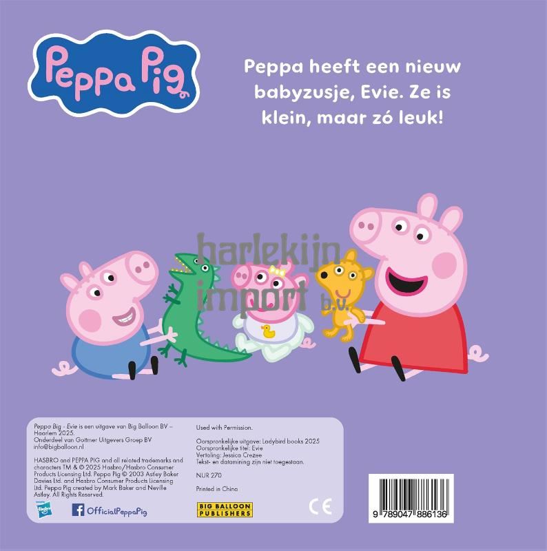 In het Peppa Pig 'Evie'-kartonboek, krijgen Peppa en George een babyzusje, Evie. Ze zat eerst in de buik van Mama Big. Evie is heel klein, huilt soms, maar is zó leuk! Peppa Pig is het schattige en ondeugende biggetje uit de gelijknamige wereldberoemde en razend populaire animatieserie. Ze woont samen met haar kleine broertje George, Mama Big en Papa Big en houdt van spelletjes spelen, verkleden, dagjes uit en in modderpoelen springen! Peppa's avonturen eindigen altijd goed en met een vrolijke knor. Lees ook de andere Peppa Pig-boeken: 'Peppa's eerste zwemles', 'Toet. Toet! Vrrroem!' en 'Peppa krijgt een zusje'.