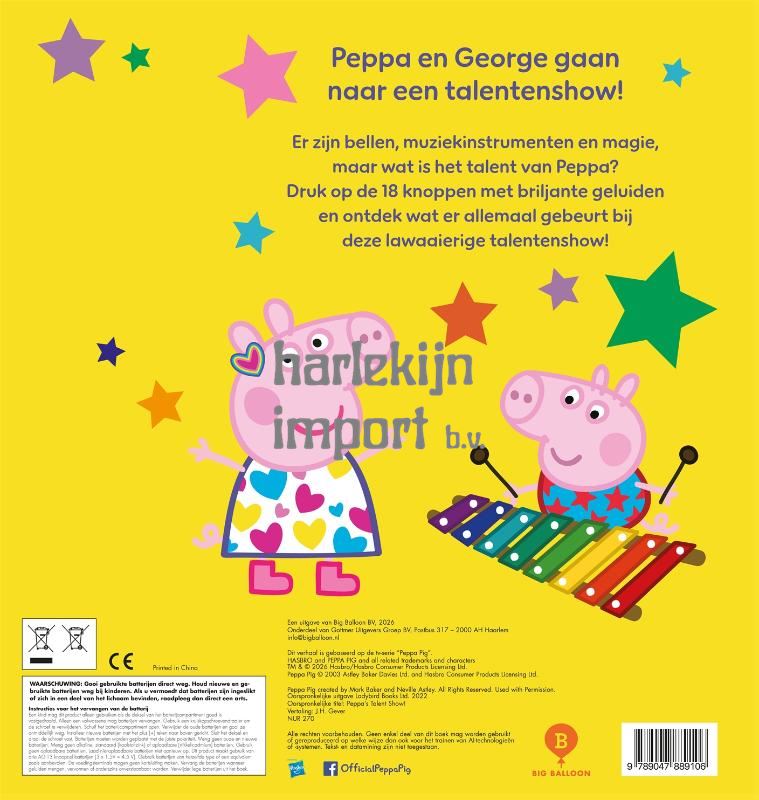 'Peppa is een ster!': een Peppa Pig-kartonboek waarin Peppa en George naar een talentenshow gaan. Er is muziek, magie en een pratende papegaai. George treedt op met Papa Big, maar wat is het talent van Peppa? Dit kartonboek met 18 geluiden is een vrolijk verhaal dat op een speelse manier laat zien dat iedereen een talent heeft. Ontdek onderaan elke pagina kleine tekeningetjes die verwijzen naar geluiden passend bij de illustratie. Door de combinatie met geluiden wordt voorlezen interactief en uitdagend. Een leuk Peppa Pig-boek geschikt voor kinderen vanaf 2 jaar. Peppa Pig is het schattige en ondeugende biggetje uit de gelijknamige wereldberoemde en razend populaire animatieserie. Ze woont samen met haar kleine broertje George, Mama Big en Papa Big en houdt van spelletjes spelen, verkleden, dagjes uit en in modderpoelen springen! Peppa's avonturen eindigen altijd goed en met een vrolijke knor. Lees ook de andere Peppa Pig-boeken zoals 'Peppa krijgt een zusje', 'Peppa's voorleesboek', 'Ik zie, ik zie... op de boerderij' en meer.