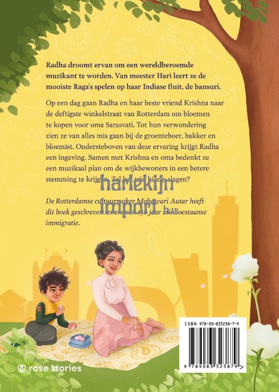 Radha droomt ervan om een wereldberoemde muzikant te worden. Van meester Hari leert ze de mooiste Raga's spelen op haar Indiase fluit, de bansuri. Op een dag gaan Radha en haar beste vriend Krishna naar de deftigste winkelstraat van Rotterdam om bloemen te kopen voor oma Sarasvati. Tot hun verwondering zien ze van alles mis gaan bij de groenteboer, bakker en bloemist. Ondersteboven van deze ervaring krijgt Radha een ingeving. Samen met Krishna en oma bedenkt ze een muzikaal plan om de wijkbewoners in een betere stemming te krijgen. Zal het trio hierin slagen? De Rotterdamse cultuurmaker Mahesvari Autar heeft dit boek geschreven ter ere van 150 jaar Hindoestaanse immigratie.