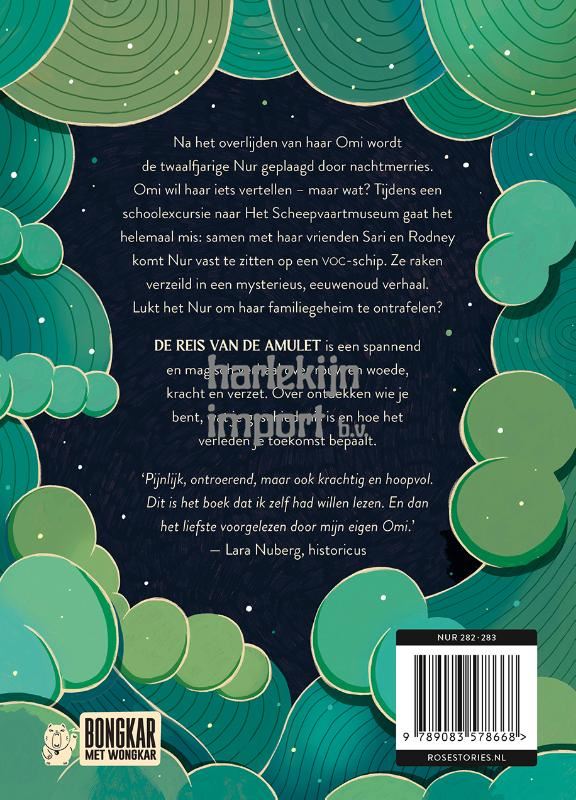 Na het overlijden van haar Omi wordt de twaal arige Nur geplaagd door nachtmerries. Omi wil haar iets vertellen – maar wat? Tijdens een schoolexcursie naar Het Scheepvaartmuseum gaat het helemaal mis: samen met haar vrienden Sari en Rodney komt Nur vast te zitten op een VOC-schip. Ze raken verzeild in een mysterieus, eeuwenoud verhaal. Lukt het Nur om haar familiegeheim te ontrafelen?| DE REIS VAN DE AMULET is een spannend en magisch verhaal over rouw en woede, kracht en verzet. Over ontdekken wie je bent, wat je geschiedenis is en hoe het verleden je toekomst bepaalt. ‘Pijnlijk, ontroerend, maar ook krachtig en hoopvol. Dit is het boek dat ik zelf had willen lezen. En dan het liefste voorgelezen door mijn eigen Omi.’ — Lara Nuberg, historicus