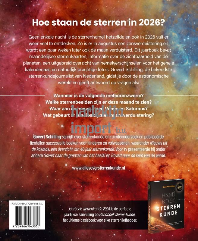 Hoe staan de sterren in 2026? Het complete jaaroverzicht Al bijna vijfentwintig jaar wijst Govert Schilling met het Jaarboek sterrenkunde de beginnende én de geoefende sterrenkijker de weg aan het firmament. Elk jaar weer vallen er verrassende waarnemingen te doen en bijzondere natuurfenomenen te zien. Zo zal er in augustus 2026 een totale zonsverduistering zijn en wordt een paar weken later ook de maan verduisterd. Jaarboek sterrenkunde is de actuele aanvulling op de klassieker Handboek sterrenkunde en bevat maandelijkse sterrenkaarten, informatie over de zichtbaarheid van de planeten, een uitgebreid overzicht van hemelverschijnselen voor het gehele kalenderjaar, en natuurlijk prachtige foto’s. • De jaarlijkse aanvulling op Handboek sterrenkunde• Van de bekendste sterrenkundejournalist van de Lage Landen • Met handige maankalender en sterrenkaarten ‘Per maand toont Schilling een overzichtelijk kaartje van de sterrenhemel en beschrijft bijzondere data. Ook zie je in één oogopslag wanneer het precies volle en nieuwe maan is. Fraai zijn ook de vele afbeeldingen.’ - NRC