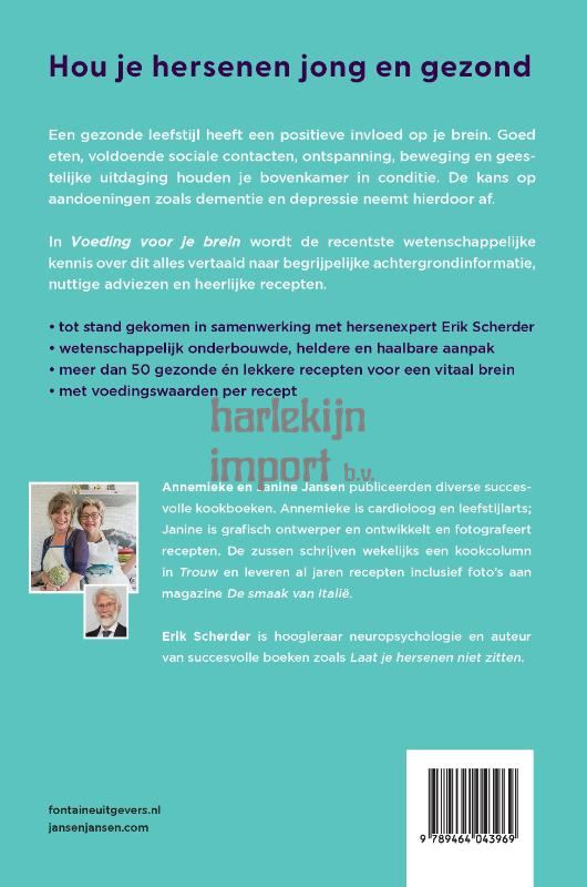 Hét kookboek voor wie zijn hersenen gezond wil houden In Voeding voor je brein laten cardioloog Annemieke en receptenmaker-vormgever Janine Jansen samen met professor Erik Scherder zien hoe je met een eenvoudig én lekker eetpatroon je hersenen jong kunt houden. Cognitieve prestaties verbeteren en het risico op hersenaandoeningen zoals dementie en een depressie wordt kleiner. De zussen Jansen vertalen zoals altijd de meest recente wetenschappelijke kennis naar begrijpelijke informatie, concrete acties en heerlijke, fraai in beeld gebrachte recepten. Met de juiste voeding, voldoende rust en beweging, weinig stress en veel geestelijke uitdaging kun je je bovenkamer beter laten functioneren, met wat geluk ook tot op hoge leeftijd. • Geschreven door cardioloog Annemieke Jansen, hersenexpert Erik Scherder en receptontwikkelaar Janine Jansen• Actueel onderwerp in media en gezondheidszorg: invloed van leefstijl en voeding wordt steeds duidelijker• Met toegankelijke, wetenschappelijk onderbouwde uitleg over de werking van het brein en de invloed van leefstijl daarop • Helder en haalbaar stappenplan met lekkere en eenvoudige gerechten De pers over de auteurs en eerdere boeken:‘Erik Scherder schudt je wakker!’ Psychologie Magazine Over CholesteroI van Annemieke en Janine Jansen:‘Het is helemaal niet zo moeilijk om gezonder te eten.’ Santé‘Een inspirerend boek [...]. De recepten zijn gevarieerd en creatief.’ Trouw