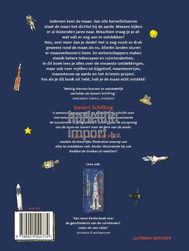 In Naar de maan neemt sterrenkundejournalist Govert Schilling zijn jonge lezers mee op een fascinerende ontdekkingsreis naar de maan. Dit boek, boordevol kleurrijke illustraties van Tjarko van der Pol, is bedoeld voor kinderen die alles willen weten over ons dichtstbijzijnde hemellichaam. Duizenden jaren lang vormde de maan een inspiratiebron voor verhalenvertellers en kunstenaars. Van mythen en bijgeloof tot schijngestalten en verduisteringen; van achterhaalde ideeën over het leven op de maan tot de nieuwste resultaten van de wetenschap – Govert Schilling behandelt het allemaal in dit boek. Illustrator Tjarko van der Pol maakte de geweldige, gedetailleerde tekeningen waarop van alles te ontdekken valt. Naar de maan verscheen eerder onder de titel De ontdekking van de maan, maar is nu geüpdatet en voorzien van nieuwe illustraties. Eerder maakten Govert en Tjarko samen Hadden de Grieken al raketten?. ‘Weinig mensen kunnen zo aanstekelijk vertellen over ruimtevaart als Govert Schilling.’ Annemarie Terhell, Kidsweek