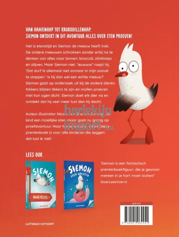 Na Siemon naar rechts en Siemon even wachten maakte Nicole van Brummelen het derde prentenboek over Siemon: Siemon proef maar. In dit los te lezen deel gaat de grappige meeuw op een verrassend proefavontuur en ontdekt hij alles over eten en proeven. Met heldere, vrolijke illustraties in kleur en een uitklappagina! Het is etenstijd en Siemon heeft trek. De andere meeuwen schrokken zonder erbij na te denken van alles naar binnen: broccoli, stinkkaas en olijven. Maar Siemon niet. 'Iewww!' roept hij. 'Dat durf ik allemaal niet zomaar in mijn snavel te stoppen!' Is hij dan wel een echte meeuw? Siemon gaat op onderzoek uit bij de andere dieren. Kikkers blijken likkers te zijn en mollen proeven met hun ogen dicht. Siemon doet elk dier na en ontdekt dat hij veel meer lust dan hij dacht. Vanaf nu eet hij elke keer als een ander dier. Nou ja, misschien niet als een mestkever...