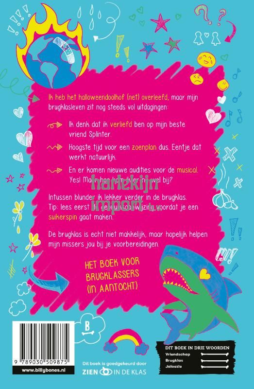 <div class="OutlineElement Ltr SCXW233340557 BCX8"> <p class="Paragraph SCXW233340557 BCX8"><span class="TextRun SCXW233340557 BCX8" lang="NL-NL" xml:lang="NL-NL" data-contrast="none"><span class="NormalTextRun SCXW233340557 BCX8">Ik heb het Halloween-doolhof (net) overleefd, maar mijn brugklasleven zit nog steeds vol uitdagingen:</span></span><span class="EOP SCXW233340557 BCX8" data-ccp-props="{"201341983":0,"335559739":160,"335559740":259}"> </span></p> </div> <div class="ListContainerWrapper SCXW233340557 BCX8"> <ul class="BulletListStyle1 SCXW233340557 BCX8" role="list"> <li class="OutlineElement Ltr SCXW233340557 BCX8" role="listitem" data-leveltext="-" data-font="Helvetica" data-listid="2" data-list-defn-props="{"201340374":2,"335552541":1,"335559685":720,"335559991":360,"469769226":"Helvetica","469769242":[8226],"469777803":"left","469777804":"-","469777815":"hybridMultilevel"}" aria-setsize="-1" data-aria-posinset="1" data-aria-level="1"> <p class="Paragraph SCXW233340557 BCX8"><span class="TextRun SCXW233340557 BCX8" lang="NL-NL" xml:lang="NL-NL" data-contrast="none"><span class="NormalTextRun SCXW233340557 BCX8">Ik denk dat ik verliefd ben op mijn beste vriend Splinter.</span></span><span class="EOP SCXW233340557 BCX8" data-ccp-props="{"201341983":0,"335559739":160,"335559740":259}"> </span></p> </li> <li class="OutlineElement Ltr SCXW233340557 BCX8" role="listitem" data-leveltext="-" data-font="Helvetica" data-listid="2" data-list-defn-props="{"201340374":2,"335552541":1,"335559685":720,"335559991":360,"469769226":"Helvetica","469769242":[8226],"469777803":"left","469777804":"-","469777815":"hybridMultilevel"}" aria-setsize="-1" data-aria-posinset="2" data-aria-level="1"> <p class="Paragraph SCXW233340557 BCX8"><span class="TextRun SCXW233340557 BCX8" lang="NL-NL" xml:lang="NL-NL" data-contrast="none"><span class="NormalTextRun SCXW233340557 BCX8">Hoogste tijd voor een zoenplan dus. Eentje dat werkt natuurlijk. </span></span><span class="EOP SCXW233340557 BCX8" data-ccp-props="{"201341983":0,"335559739":160,"335559740":259}"> </span></p> </li> <li class="OutlineElement Ltr SCXW233340557 BCX8" role="listitem" data-leveltext="-" data-font="Helvetica" data-listid="2" data-list-defn-props="{"201340374":2,"335552541":1,"335559685":720,"335559991":360,"469769226":"Helvetica","469769242":[8226],"469777803":"left","469777804":"-","469777815":"hybridMultilevel"}" aria-setsize="-1" data-aria-posinset="3" data-aria-level="1"> <p class="Paragraph SCXW233340557 BCX8"><span class="TextRun SCXW233340557 BCX8" lang="NL-NL" xml:lang="NL-NL" data-contrast="none"><span class="NormalTextRun SCXW233340557 BCX8">En er komen nieuwe audities voor de musical. Yes! Maar hoe kom ik er nu wel bij? </span></span><span class="EOP SCXW233340557 BCX8" data-ccp-props="{"201341983":0,"335559739":160,"335559740":259}"> </span></p> </li> </ul> </div> <div class="OutlineElement Ltr SCXW233340557 BCX8"> <p class="Paragraph SCXW233340557 BCX8"><span class="TextRun SCXW233340557 BCX8" lang="NL-NL" xml:lang="NL-NL" data-contrast="none"><span class="NormalTextRun SCXW233340557 BCX8">Intussen blunder ik lekker verder in de brugklas. </span></span><span class="EOP SCXW233340557 BCX8" data-ccp-props="{"201341983":0,"335559739":160,"335559740":259}"> </span></p> </div> <div class="OutlineElement Ltr SCXW233340557 BCX8"> <p class="Paragraph SCXW233340557 BCX8"><span class="TextRun SCXW233340557 BCX8" lang="NL-NL" xml:lang="NL-NL" data-contrast="none"><span class="NormalTextRun SCXW233340557 BCX8">Tip: lees eerst de gebruiksaanwijzing voordat je een suikerspin gaat maken.</span></span><span class="EOP SCXW233340557 BCX8" data-ccp-props="{"201341983":0,"335559739":160,"335559740":259}"> </span></p> </div> <div class="OutlineElement Ltr SCXW233340557 BCX8"> <p class="Paragraph SCXW233340557 BCX8"><span class="TextRun SCXW233340557 BCX8" lang="NL-NL" xml:lang="NL-NL" data-contrast="none"><span class="NormalTextRun SCXW233340557 BCX8">De brugklas is echt niet makkelijk, maar hopelijk helpen mijn missers jou bij je voorbereidingen.</span></span><span class="EOP SCXW233340557 BCX8" data-ccp-props="{"201341983":0,"335559739":160,"335559740":259}"> </span></p> </div> <div class="OutlineElement Ltr SCXW233340557 BCX8"> <p class="Paragraph SCXW233340557 BCX8"><span class="EOP SCXW233340557 BCX8" data-ccp-props="{"201341983":0,"335559739":160,"335559740":259}"> </span></p> </div> <div class="OutlineElement Ltr SCXW233340557 BCX8"> <p class="Paragraph SCXW233340557 BCX8"><span class="TextRun SCXW233340557 BCX8" lang="NL-NL" xml:lang="NL-NL" data-contrast="none"><span class="NormalTextRun SCXW233340557 BCX8">Het boek voor brugklassers (in aantocht)</span><span class="NormalTextRun SCXW233340557 BCX8">!</span></span><span class="EOP SCXW233340557 BCX8" data-ccp-props="{"201341983":0,"335559739":160,"335559740":259}"> </span></p> </div>