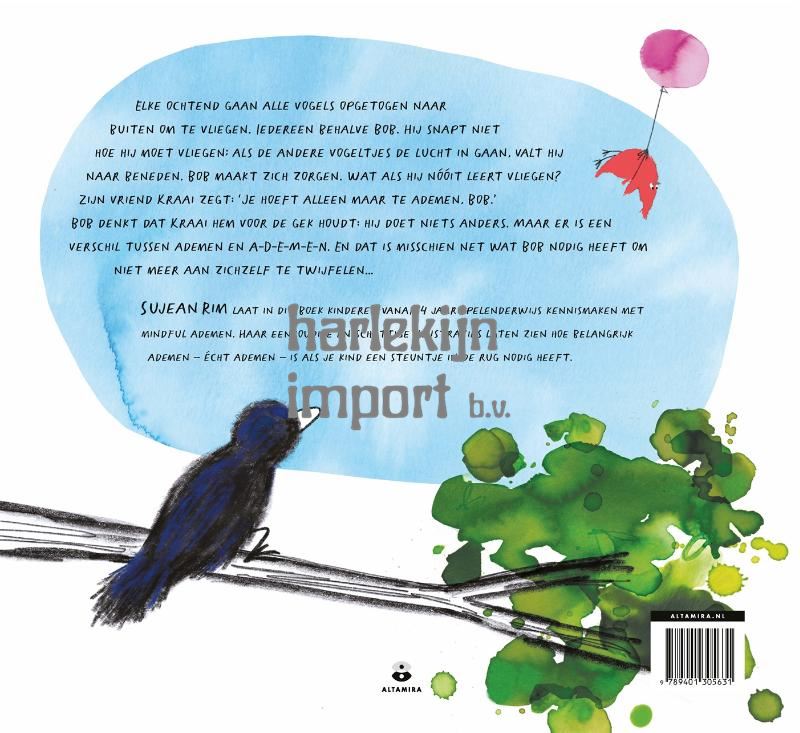 In 'Adem in...' van Sujean Rim lezen kinderen het bijzondere verhaal van Bob, de vogel die niet kan vliegen. Dit prachtige prentenboek leert kinderen het belang van goed ademen, gronden én mindfulness, vooral als ze een steuntje in de rug kunnen gebruiken. En Bob kan die zeker gebruiken, want hij wil niet achterblijven! Hij maakt zich ontzettende zorgen: wat als hij nooit leert vliegen? Bob weet niet wat hij moet doen tot zijn vriend Kraai hem vertelt hoe belangrijk het is om adem te halen. Hij zegt: 'Je hoeft alleen maar te ademen, Bob.' Bob snapt het niet: hij doet toch niet anders dan ademhalen? Maar er is een groot verschil tussen ademen en A-D-E-M-E-N. En dát is net wat Bob nodig heeft om niet meer aan zichzelf te twijfelen.