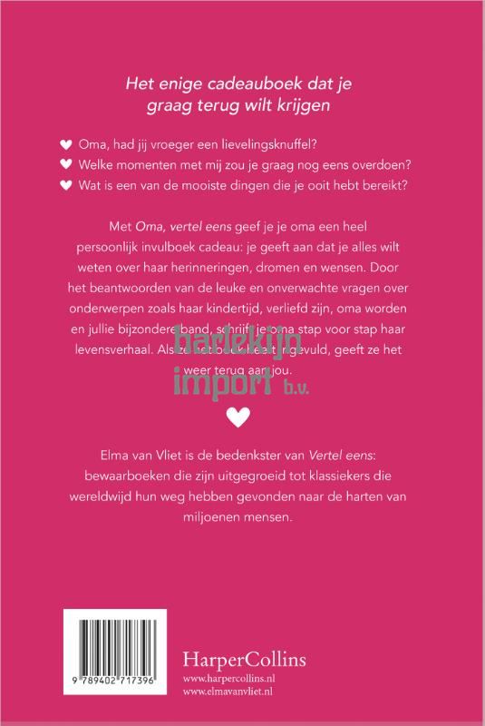 Oma, vertel eens is een compleet vernieuwd en herzien invulboek in de Vertel eens-serie van Elma van Vliet.'Oma, had jij vroeger een lievelingsknuffel? Welke momenten met mij zou je graag nog eens overdoen? Wat is een van de mooiste dingen die je ooit hebt bereikt?'Met Oma, vertel eens geef je je oma een ultiem invulboek cadeau: je geeft aan dat je alles wilt weten over haar herinneringen, dromen en wensen. Door het invullen van de leuke en onverwachte vragen over onderwerpen zoals haar kindertijd, verliefd zijn, moeder worden en de bijzondere band tussen oma en kleinkind, schrijft je oma stap voor stap haar levensverhaal. Of maak het nog specialer door het boek samen in te vullen en in gesprek te gaan. Zo ontstaat er een uniek en persoonlijk boek van jullie samen. Als je oma het boek heeft ingevuld, geeft ze het weer terug aan jou.Elma van Vliet is bekend geworden met het boek Mam, vertel eens, dat ze maakte voor haar moeder toen die ernstig ziek werd en ze haar nog zoveel wilde vragen. Het werd het eerste deel in de Vertel eens-serie: een reeks producten die helpen bij het maken, delen en bewaren van dierbare en waardevolle herinneringen. Elma's boeken en spellen zorgen in de drukke wereld waarin we leven voor écht contact met de mensen om ons heen.