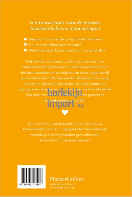 Familie, vertel eens is een bijzonder invulboek speciaal voor familieherinneringen in de Vertel eens-serie van Elma van Vliet. Elma van Vliet is de grondlegger van het genre invul- en bewaarboeken; de serie Vertel eens staat al twintig jaar garant voor kwaliteit. Met Familie, vertel eens schrijf je samen met jouw familie een persoonlijk en uniek bewaarboek. Door het beantwoorden van de originele en leuke vragen schrijf je samen heel makkelijk een familieboek om voor altijd te bewaren. Naast de vragen is er ruimte voor anekdotes over jullie familie, doorgegeven recepten en een familiekalender.Als het boek gevuld is, heb je een persoonlijk bewaarboek dat nog generaties lang gekoesterd zal worden.