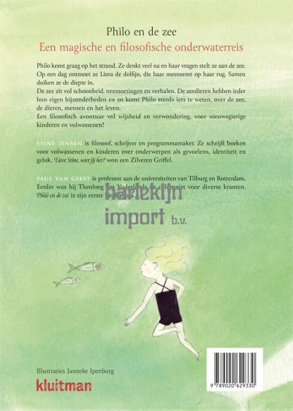 ‘Ik heet Philomeen, maar iedereen noemt mij Philo.’ Philo komt graag op het strand om haar zorgen te vergeten en uit te waaien. Ze zit vol vragen, die ze stelt aan de zee. Op een dag ontmoet ze Liora de dolfijn, die haar meeneemt op haar rug. Samen duiken ze de diepte in. De zee zit vol schoonheid en verwondering, ontmoetingen en verhalen. Onder water blijkt niets zomaar gewoon: elke -ontmoeting brengt Philo een nieuw inzicht. Petra de schildpad toont de kracht om verder te gaan ook als het leven tegenzit, Harriët het -harinkje laat zien dat je samen sterker staat en Skuggi, de lelijke -murene, verrast Philo met zijn mooie innerlijk. Ook Antonios de potvis, Cioran het zeepaard en Salma de inktvis hebben wat te vertellen. En Philo luistert graag! Een filosofisch avontuur vol wijsheid en verwondering – over de zee, de dieren, en vooral over wat het betekent om mens te zijn. Voor nieuwsgierige kinderen en volwassenen!