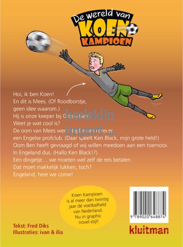 Hoi, ik ben Koen! En dit is Mees. (Of Roodborstje,geen idee waarom.) Hij is onze keeper bij Groen Geel. Weet je wat cool is? De oom van Mees werkt bij Dream Forever, een Engelse profclub. (Daar speelt Ken Black, mijn grote held!) Oom Ben heeft gevraagd of wij willen meedoen aan een toernooi. In Engeland dus. (Hallo Ken Black!?) Eén dingetje… we moeten wel zelf de reis betalen. Dat moet makkelijk lukken, toch? Engeland, here we come!