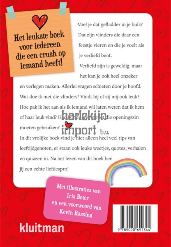 Heb jij al eens vlinders in je buik gehad? Zit je in de klas stiekem te kijken naar iemand die je erg leuk vindt en word je verlegen als diegene terugkijkt? Maakt je hart een sprongetje als je hem of haar ziet? Grote kans dat je verliefd bent. Maar wat doe je met die vlinders? En hoe pak je het aan om iemand te laten weten dat je hem of haar heel leuk vindt, zonder dat je voor de ogen van iedereen een blauwtje loopt? In dit leuke, vrolijke boek lees je alles over verliefd zijn en krijg je tips van ervaringsdeskundigen. Daarnaast zijn er quotes, anekdotes, leuke weetjes en spelletjes. Voor je het weet ben je zelf een liefdespro! De fantastische illustraties zijn gemaakt door Iris Boter (die nog altijd verliefd is).