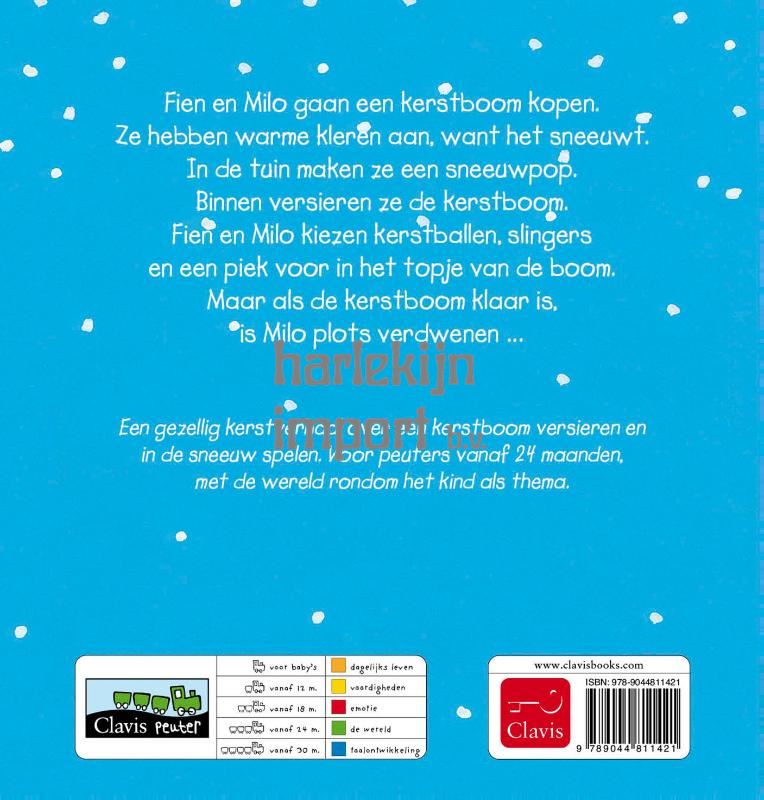 Fien en Milo gaan een kerstboom kopen. Ze hebben warme kleren aan, want het sneeuwt. In de tuin maken ze een sneeuwpop. Binnen versieren ze de kerstboom. Fien en Milo kiezen kerstballen, slingers en een piek voor boven in de boom. Maar als de kerstboom klaar is, is Milo plots verdwenen.