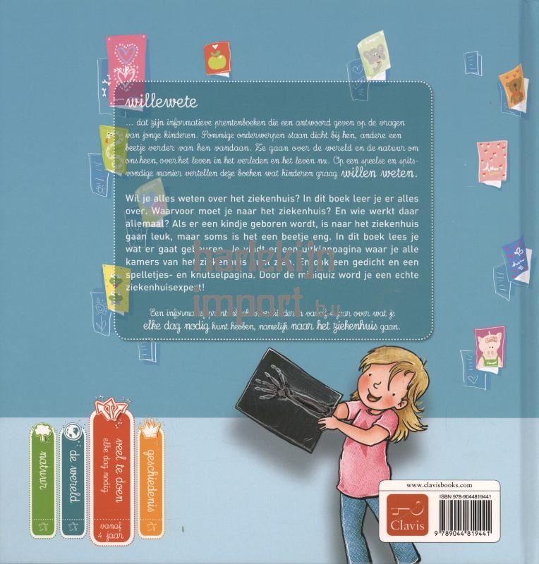 Wil je alles weten over het ziekenhuis? In dit boek leer je er alles over. Wanneer moet je naar het ziekenhuis? En wie kom je daar allemaal tegen? Je ontdekt welke verschillende afdelingen en dokters er zijn. Je komt te weten dat naar het ziekenhuis gaan soms leuk is, als er een kindje geboren wordt bijvoorbeeld, en niet altijd eng. In dit boek vind je ook een gedicht, twee knutselpagina's en een grote uitklappagina. Door de miniquiz word je een echte ziekenhuisexpert!