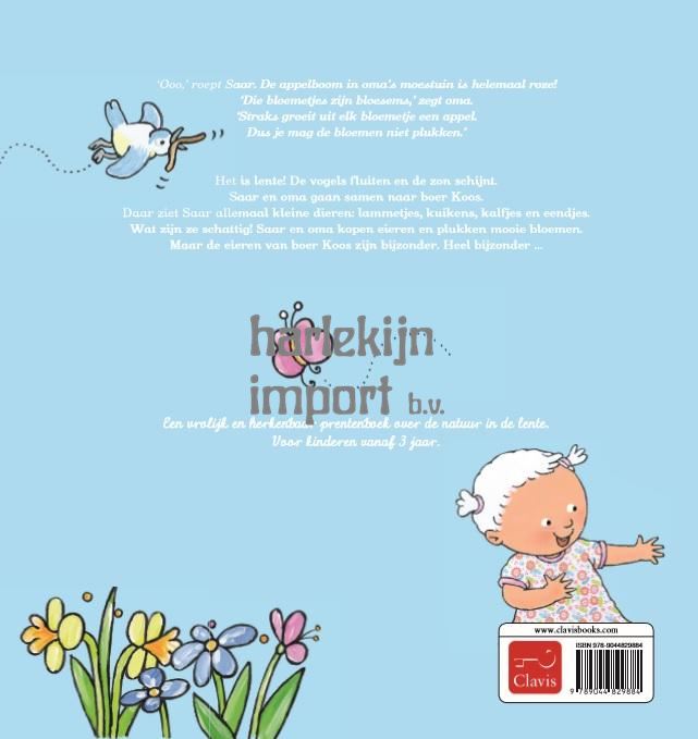 Het is lente! De vogels fluiten en de zon schijnt. Saar en oma gaan samen naar boer Koos. Daar ziet Saar allemaal kleine dieren: lammetjes, kuikens, kalfjes en eendjes. Wat zijn ze schattig! Saar en oma kopen eieren en plukken mooie bloemen. Maar de eieren van boer Koos zijn bijzonder. Heel bijzonder ...