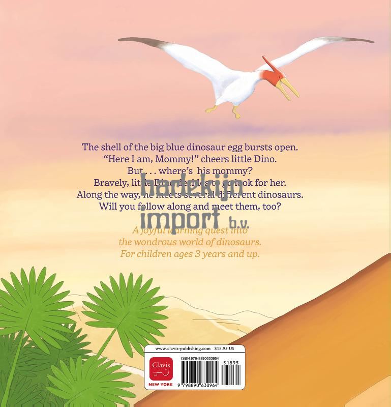 The shell of the big blue dinosaur egg bursts open. “Here I am, Mommy!” cheers little Dino. But . . . where’s his mommy? Bravely, little Dino decides to go look for her. Along the way, he meets several different dinosaurs. Will you follow along and meet them, too? A joyful learning quest into the wondrous world of dinosaurs. For children ages 3 years and up.