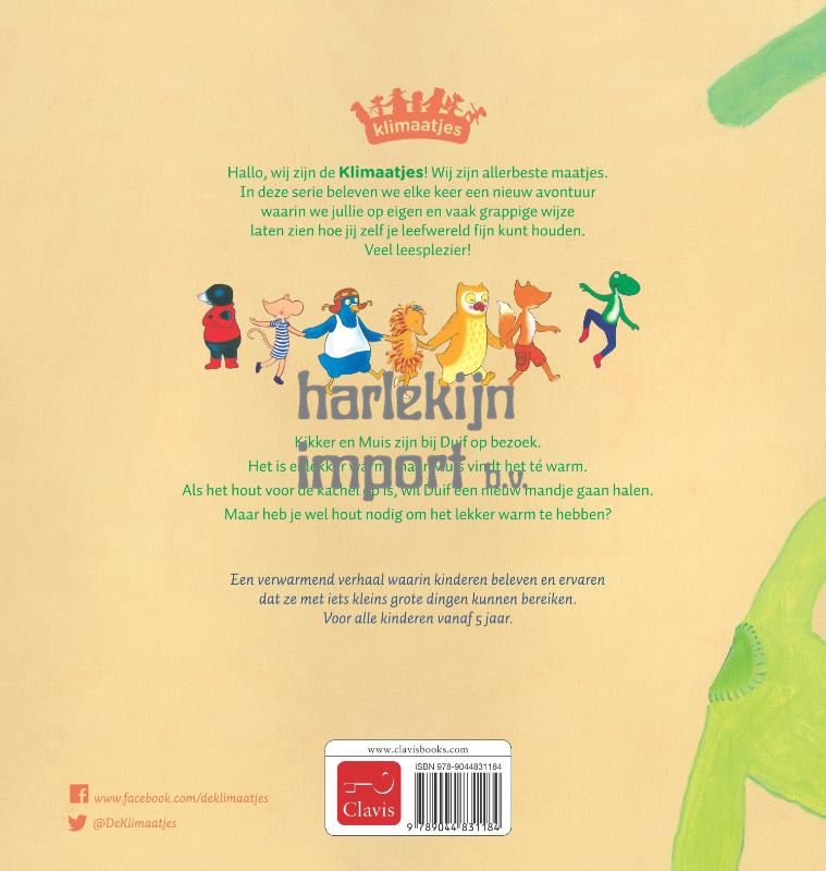 Hallo, wij zijn de Klimaatjes! Wij zijn allerbeste maatjes. In deze serie beleven we elke keer een nieuw avontuur waarin we jullie op eigen en vaak grappige wijze laten zien hoe jij zelf je leefwereld fijn kunt houden. Veel leesplezier! Kikker en Muis zijn bij Duif op bezoek. Het is er lekker warm, maar Muis vindt het té warm. Als het hout voor de kachel op is, wil Duif een nieuw mandje gaan halen. Maar heb je wel hout nodig om het lekker warm te hebben? Een verwarmend verhaal waarin kinderen beleven en ervaren dat ze met iets kleins grote dingen kunnen bereiken. Voor alle kinderen vanaf 5 jaar.