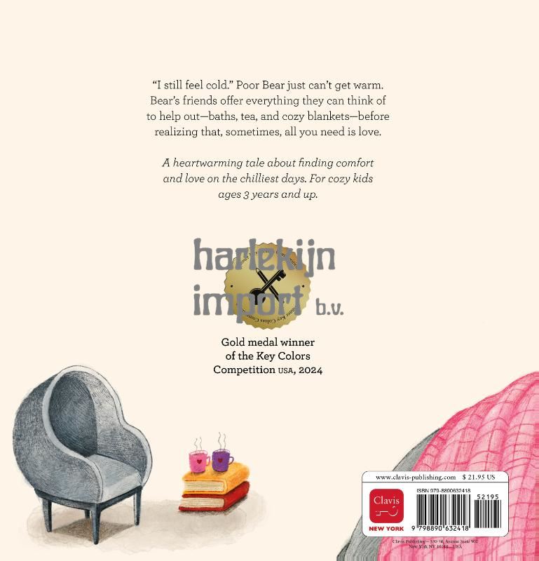 “I still feel cold.” Poor Bear just can’t get warm. Bear’s friends offer everything they can think of to help out—baths, tea, and cozy blankets—before realizing that, sometimes, all you need is love. A heartwarming tale about finding comfort and love on the chilliest days. For cozy kids ages 3 years and up. ?Gouden button ‘Winner Key Colors Competition USA’ (zie achterflap The New Bicycle 9781605379647)? Gold medal winner of the Key Colors Competition USA, 2024