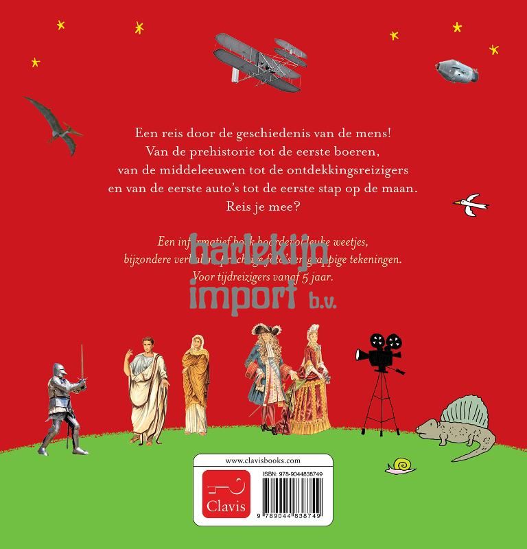 Een reis door de geschiedenis van de mens! Van de prehistorie tot de eerste boeren, van de middeleeuwen tot de eerste auto's, en van de ontdekkingsreizigers tot de eerste stap op de maan. Reis je mee?