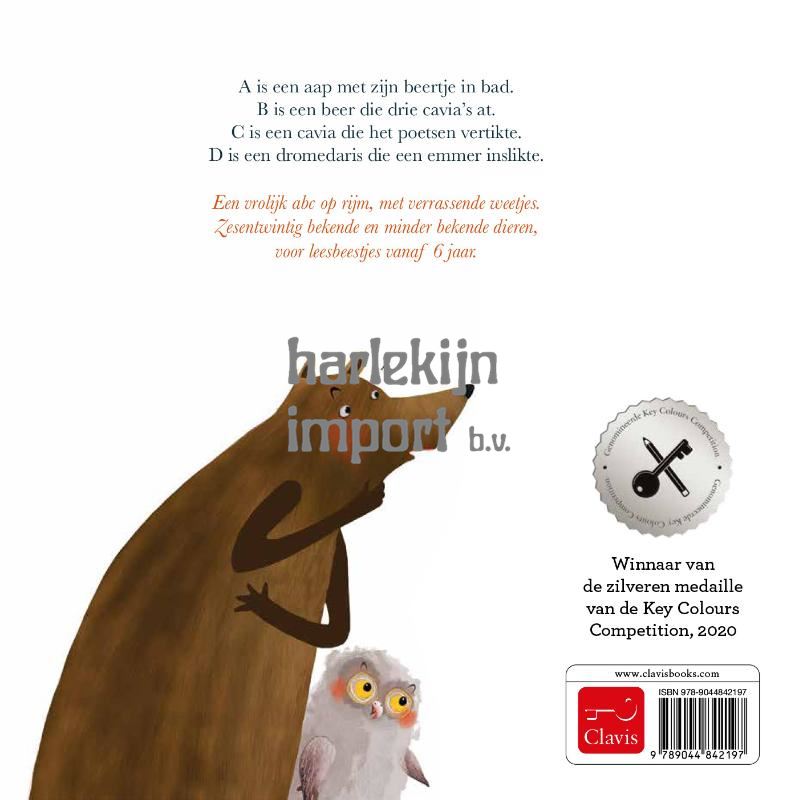 Een vrolijk abc op rijm, met verrassende feitjes. Zesentwintig bekende en minder bekende dieren, voor leesbeestjes vanaf 6 jaar. A is een aap met zijn beertje in bad. B is een beer die drie cavia’s at. C is een cavia die het poetsen vertikte. D is een dromedaris die een emmer inslikte.