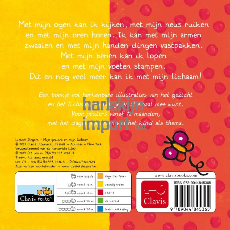 Met mijn ogen kan ik kijken, met mijn neus ruiken en met mijn oren horen. Ik kan met mijn armen zwaaien en met mijn handen dingen vastpakken. Met mijn benen kan ik lopen en met mijn voeten stampen. Dit en nog veel meer kan ik met mijn lichaam! Een boekje vol herkenbare illustraties van het gezicht en het lichaam, en wat je er allemaal mee kunt. Voor peuters vanaf 12 maanden, met het dagelijks leven van het kind als thema.