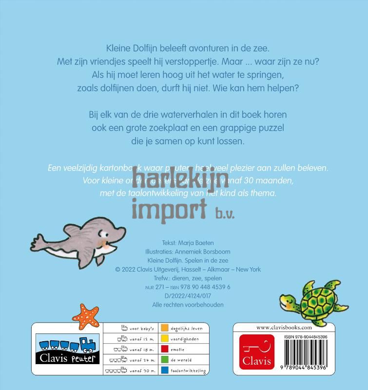 Kleine Dolfijn beleeft avonturen in de zee. Als hij verstoppertje speelt, vindt hij niet zijn vriendjes, maar wel ... een bewegende steen! In een ander verhaal moet Kleine Dolfijn leren om hoog uit het water te springen. Hij vindt het eng en durft niet. Gelukkig zijn er de fijne dierenvriendjes die hem helpen. Bij elk van de drie waterverhalen in dit boek hoort ook een grote zoekplaat en een grappige puzzel die je samen op kunt lossen. Een veelzijdig kartonboek waar peuters heel veel plezier aan zullen beleven. Voor kleine onderzoekers van de zee vanaf 30 maanden, met tellen als thema.