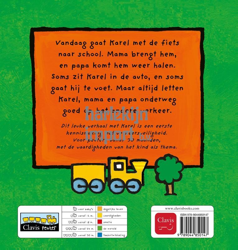 Vandaag gaat Karel met de fiets naar school. Mama brengt hem, en papa komt hem weer halen. Soms zit Karel in de auto, en soms gaat hij te voet. Maar altijd letten Karel, mama en papa onderweg goed op het andere verkeer. Dit leuke verhaal met Karel is een eerste kennismaking met verkeersveiligheid. Voor peuters vanaf 30 maanden, met de vaardigheden van het kind als thema.