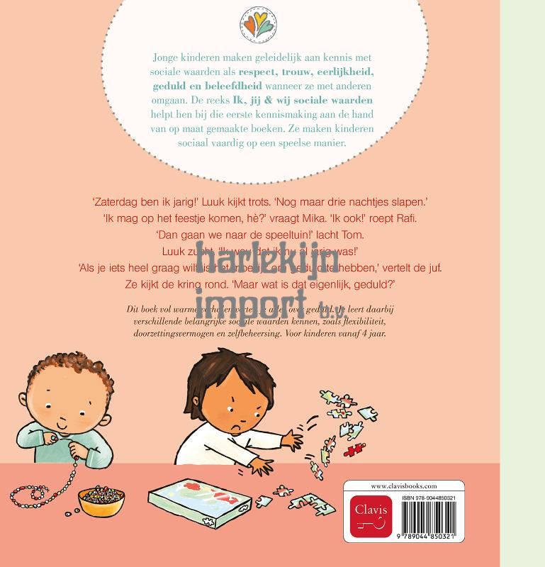 Jonge kinderen maken geleidelijk aan kennis met sociale waarden als respect, trouw, eerlijkheid, geduld en beleefdheid wanneer ze met anderen omgaan. De reeks Ik, jij & wij sociale waarden helpt hen bij die eerste kennismaking aan de hand van op maat gemaakte boeken. Ze maken kinderen sociaal vaardig op een speelse manier. ‘Zaterdag ben ik jarig!’ Luuk kijkt trots. ‘Nog maar drie nachtjes slapen.’ ‘Ik mag op het feestje komen, hè?’ vraagt Mika. ‘Ik ook!’ roept Rafi. ‘Dan gaan we naar de speeltuin!’ lacht Tom. Luuk zucht. ‘Ik wou dat ik nu al jarig was!’ ‘Als je iets heel graag wilt, is het moeilijk om geduld te hebben,’ vertelt de juf. Ze kijkt de kring rond. ‘Maar wat is dat eigenlijk, geduld?’ Dit boek vol warme verhalen vertelt je alles over geduld. Je leert daarbij verschillende belangrijke sociale waarden kennen, zoals flexibiliteit, doorzettingsvermogen en zelfbeheersing. Voor kinderen vanaf 4 jaar.