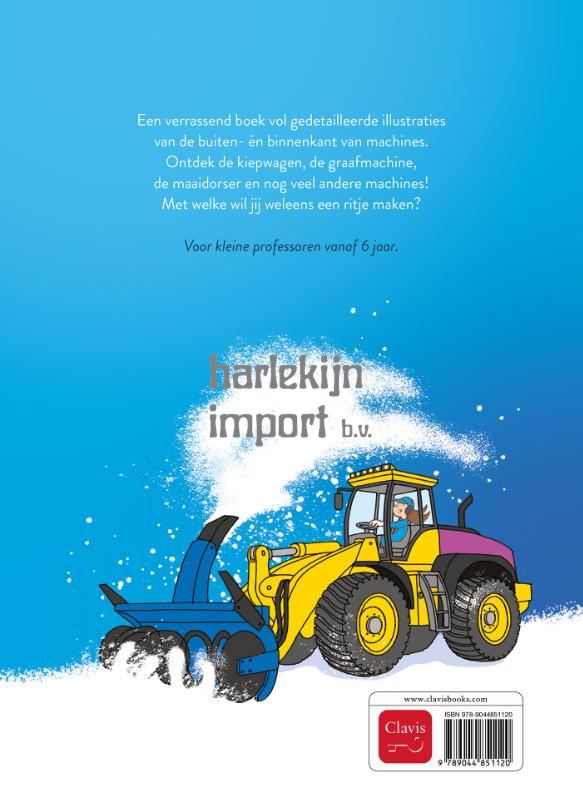 Een verrassend boek vol gedetailleerde illustraties van de buiten- én binnenkant van machines. Ontdek de kiepwagen, de graafmachine, de maaidorser en nog veel andere machines! Met welke wil jij weleens een ritje maken? Voor kleine professoren vanaf 6 jaar.