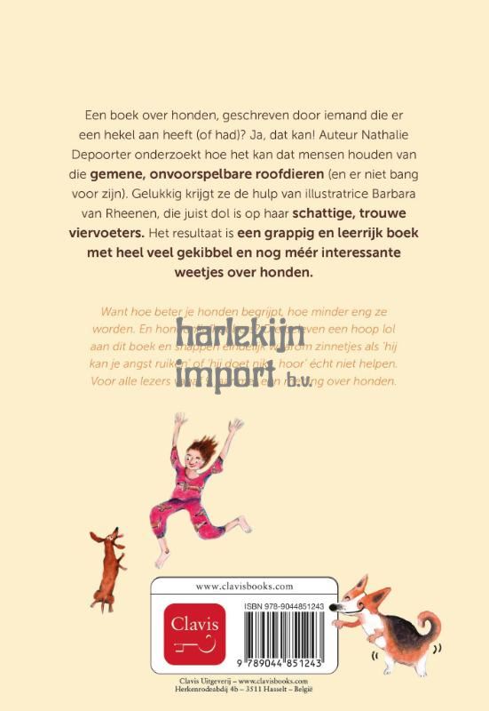 Een boek over honden, geschreven door iemand die er een hekel aan heeft (of had)? Ja, dat kan! Auteur Nathalie Depoorter onderzoekt hoe het kan dat mensen houden van die gemene, onvoorspelbare roofdieren (en er niet bang voor zijn). Gelukkig krijgt ze de hulp van illustratrice Barbara van Rheenen, die juist dol is op haar schattige, trouwe viervoeters. Het resultaat is een grappig en leerrijk boek met heel veel gekibbel en nog méér interessante weetjes over honden. Want hoe beter je honden begrijpt, hoe minder eng ze worden. En hondenliefhebbers? Die beleven een hoop lol aan dit boek en snappen eindelijk waarom zinnetjes als ‘hij kan je angst ruiken’ of ‘hij doet niks, hoor’ écht niet helpen. Voor alle lezers vanaf 9 jaar met een mening over honden.