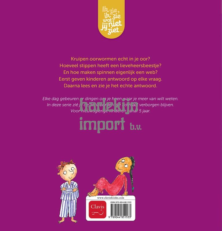 Kruipen oorwormen echt in je oor? Hoeveel stippen heeft een lieveheersbeestje? En hoe maken spinnen eigenlijk een web? Eerst geven kinderen antwoord op elke vraag. Daarna lees en zie je het echte antwoord. Elke dag gebeuren er dingen om je heen waar je meer van wilt weten. In deze serie ziƩ je de antwoorden die normaal verborgen blijven. Voor nieuwsgierige kinderen vanaf 5 jaar.
