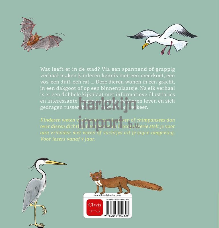 Wat leeft er in de stad? Via een spannend of grappig verhaal maken kinderen kennis met een meerkoet, een vos, een duif, een waterrat ... Deze dieren wonen in een parkeergarage, in de gracht of bij een speeltuin. Na elk verhaal is er een dubbele kijkplaat met informatieve illustraties en interessante weetjes over hoe de dieren leven en zich gedragen in de verschillende seizoenen. Kinderen weten vaak meer over leeuwen of chimpansees dan over dieren dichtbij. Deze boeiende biotopenserie stelt je voor aan vrienden met veren of vachtjes uit je eigen omgeving. Voor lezers vanaf 7 jaar.