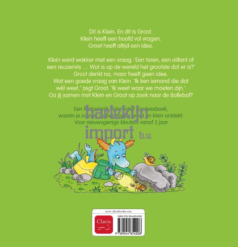 Dit is Groot. En dit is Klein. Klein heeft een hoofd vol vragen. Groot heeft altijd en idee. Klein werd wakker met een vraag: ‘Een toren, een olifant of een reuzenvis … Wat is op de wereld het grootste dat er is?’ Groot denkt na, maar heeft geen idee. Wat een goede vraag van Klein. ‘Ik ken iemand die dat wél weet,’ zegt Groot. ‘Ik weet waar we moeten zijn.’ Ga jij samen met Klein en Groot op zoek naar de Bollebof? Een fantasierijk, interactief voorleesboek, waarin je samen de begrippen groot en klein ontdekt. Voor nieuwsgierige kleuters vanaf 3 jaar.