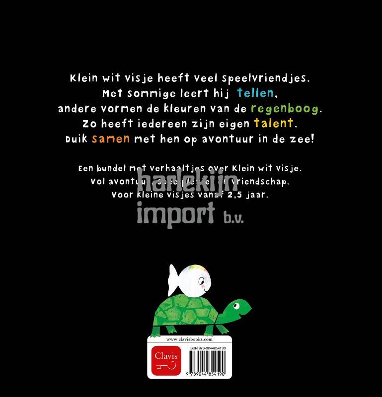 Klein wit visje heeft veel speelvriendjes. Met sommige leert hij tellen, andere vormen de kleuren van de regenboog. Zo heeft iedereen zijn eigen talent. Duik samen met hen op avontuur in de zee! Een bundel met verhaaltjes over Klein wit visje. Vol avontuur, speelplezier en vriendschap. Voor kleine visjes vanaf 2,5 jaar.