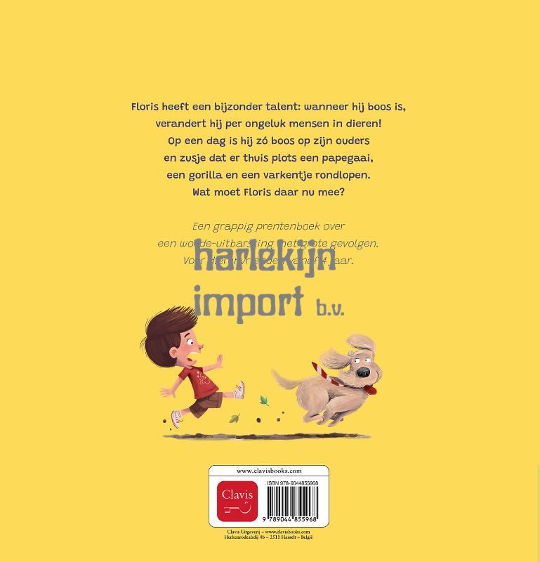 Floris heeft een bijzonder talent: wanneer hij boos is, verandert hij per ongeluk mensen in dieren! Op een dag is hij zó boos op zijn ouders en zusje dat er thuis plots een papegaai, een gorilla en een varkentje rondlopen. Wat moet Floris daar nu mee? Een grappig prentenboek over een woede-uitbarsting met grote gevolgen. Voor dierenvrienden vanaf 4 jaar.