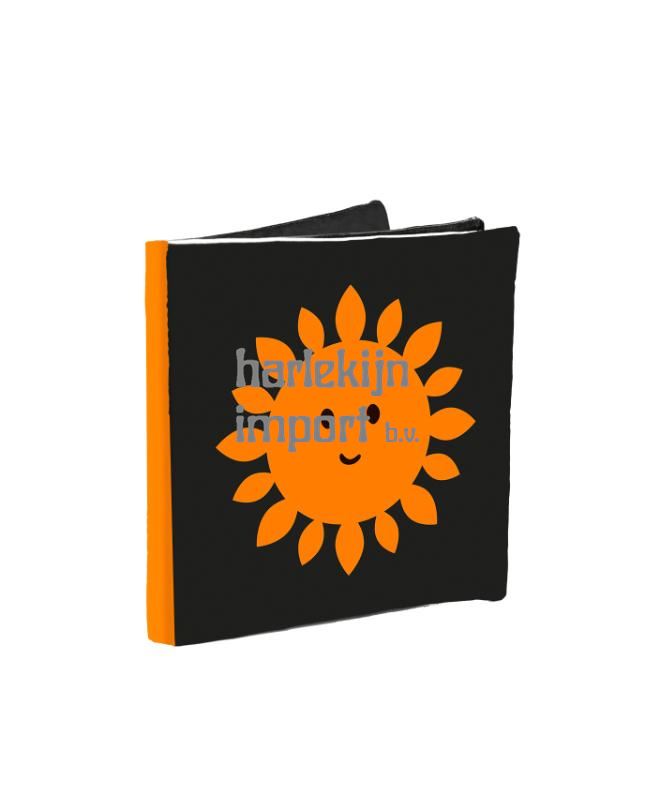 Een knisperboekje in zwart-wit, met vrolijke kleuraccenten voor baby’s.