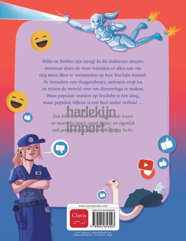 Billie en Bobbie zijn terug! In dit doldwaze nieuwe avontuur doen de twee vrienden er alles aan om nóg meer likes te verzamelen op hun YouTube-kanaal. Ze bezoeken een vloggersbeurs, unboxen erop los en reizen de wereld over om dierenvlogs te maken. Want populair worden op YouTube is één ding, maar populair blíjven is een heel ander verhaal … Een hilarisch boek voor beginnende lezers en moeilijke lezers vanaf 8 jaar, en eigenlijk ook gewoon voor iedereen die graag lacht.